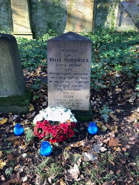 Yaniewicz is buried in Warriston Cemetery, where his gravestone commemorates ‘a most eminent and accomplished musician…honoured, loved and regretted.’ Here on the weekend of the concerts at Drummond Place, the Polish Consulate laid a wreath in national red and white, and underneath it the Friends of Warriston have planted rue, the national flower of his Lithuanian birthplace.